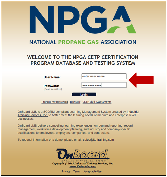 Go to www.CETPCertification.org and login to the OnBoard LCMS by entering your username and password and clicking the Login button. If you have any problems logging in use the "I forgot my password" link.
