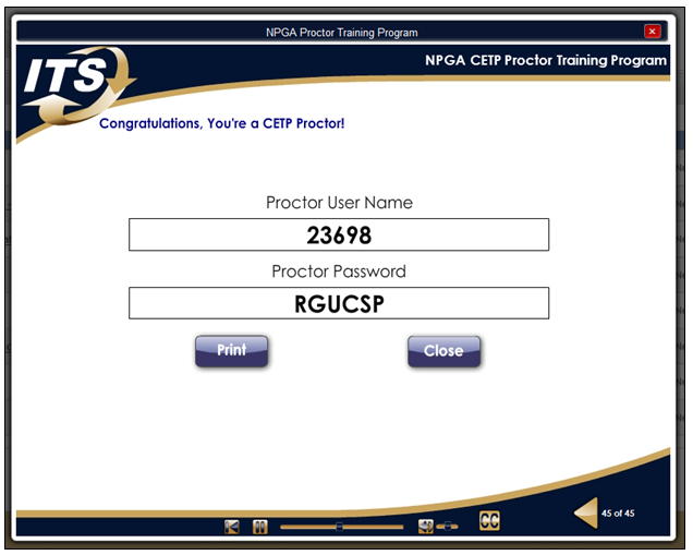 Once you have successfully completed the Proctor Exam, you will see the completion screen. There you will receive your Proctor Username and Password. Please print this off and keep it for future use. You may also retrieve it under SETTINGS/My Profile/Proctor Passwords.