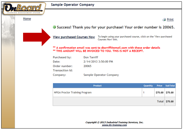 After completing the purchase, you will see the confirmation screen below. Click on the link, "View Purchased Courses Now" to go to the "My Assignments" section and take the Proctor Training Course. Click on the course name to begin the training.